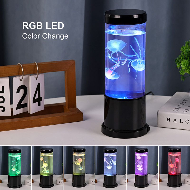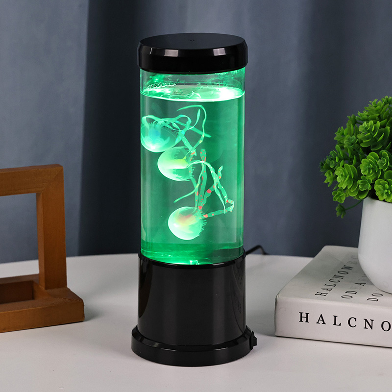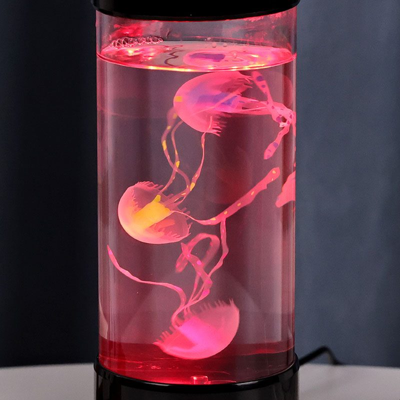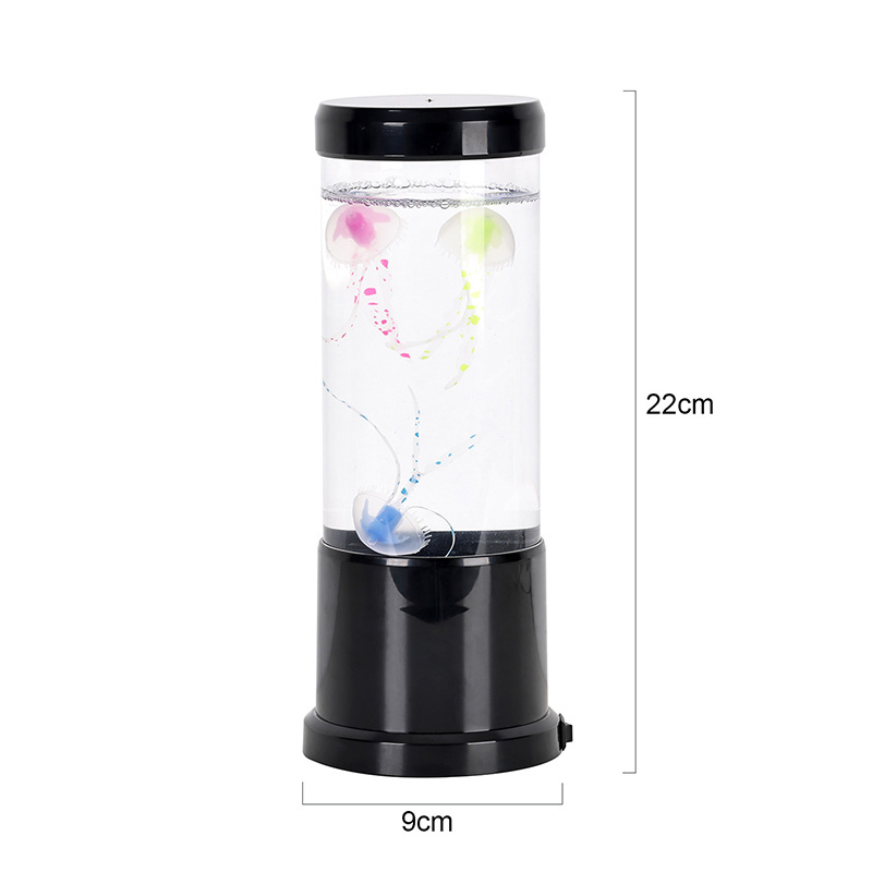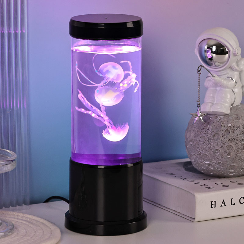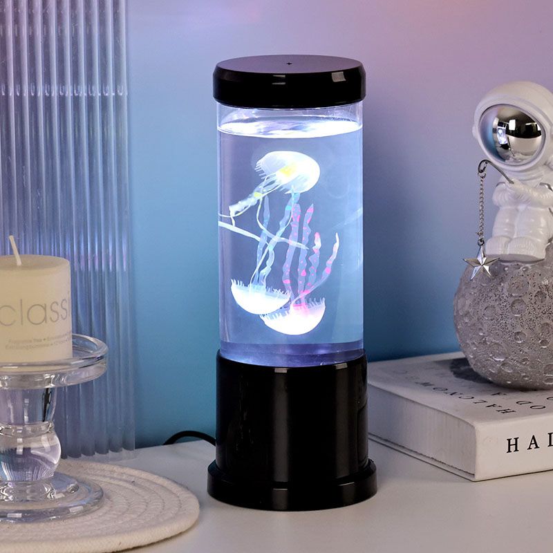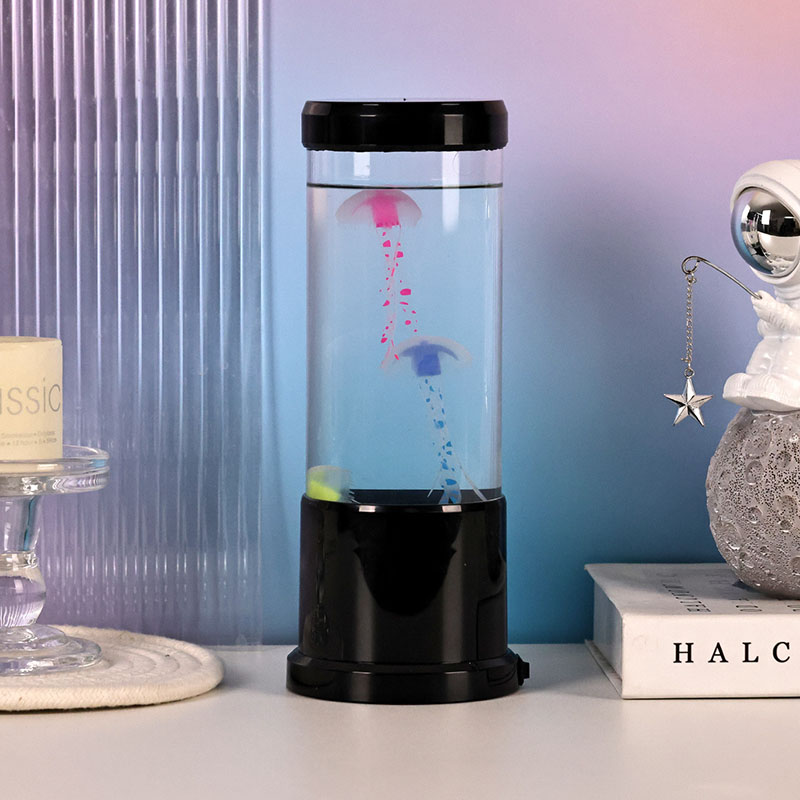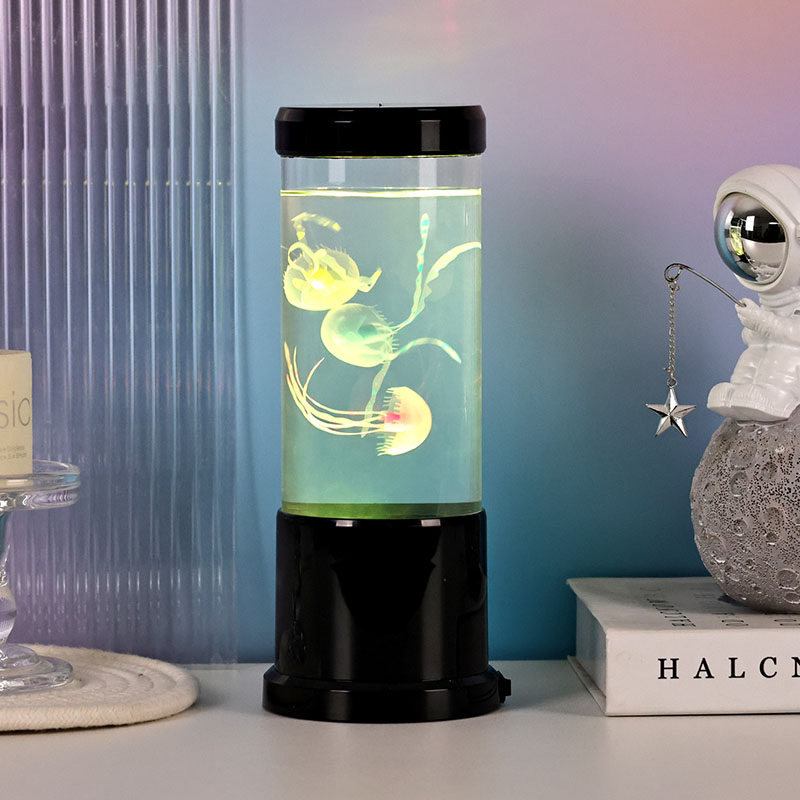 lampan har verklighetstrogna maneter i svart nyans som försiktigt flyter i en klar cylindrisk tank, vilket skapar en lugnande undervattensatmosfär som förvandlar vilket rum som helst till en fridfull tillflyktsort i havet.