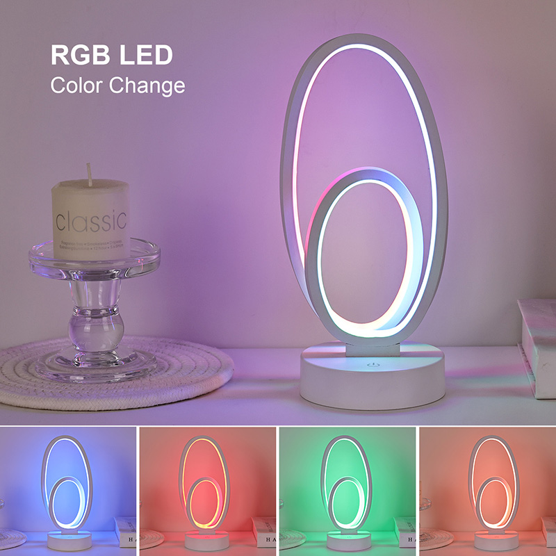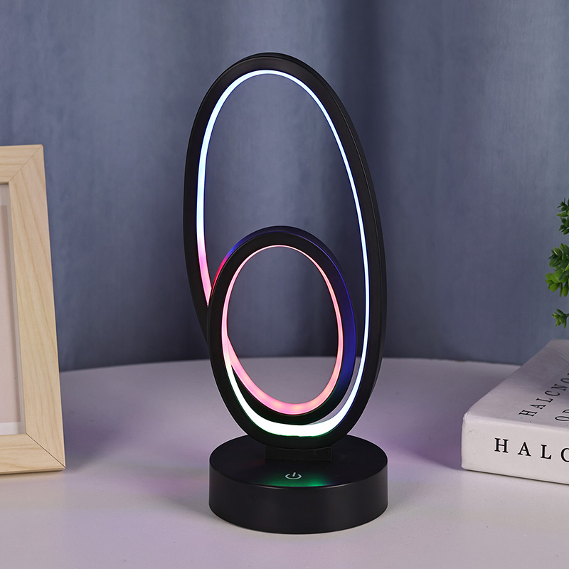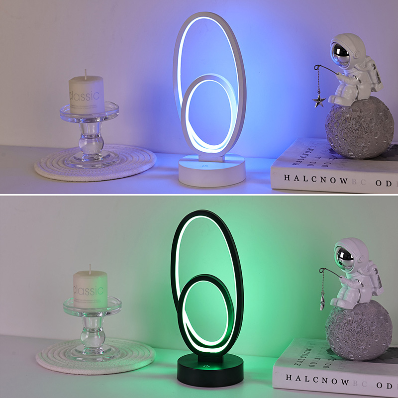 Double Circular Ring Shade RGB-bordslampa är en konstnärlig accent för hemutrymmen, med DC-säker lågspänningsströmförsörjning för stabil och energieffektiv prestanda, vilket säkerställer säker användning. Lämplig för olika scenarier som vardagsrum, barnrum, studieområden och sovrum