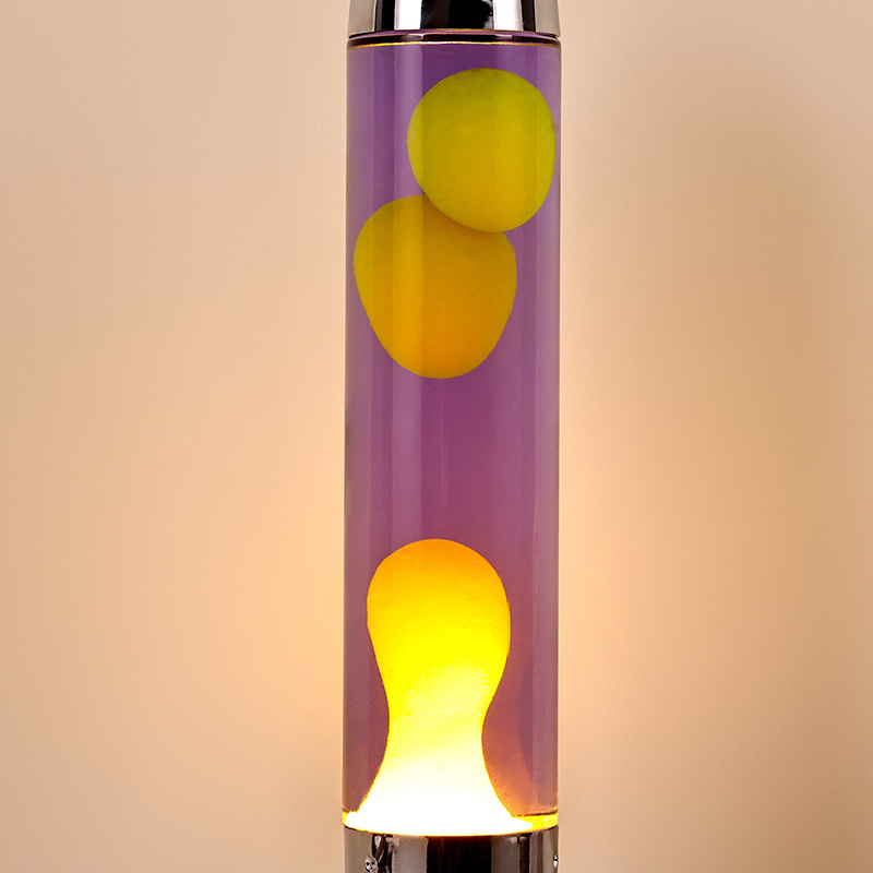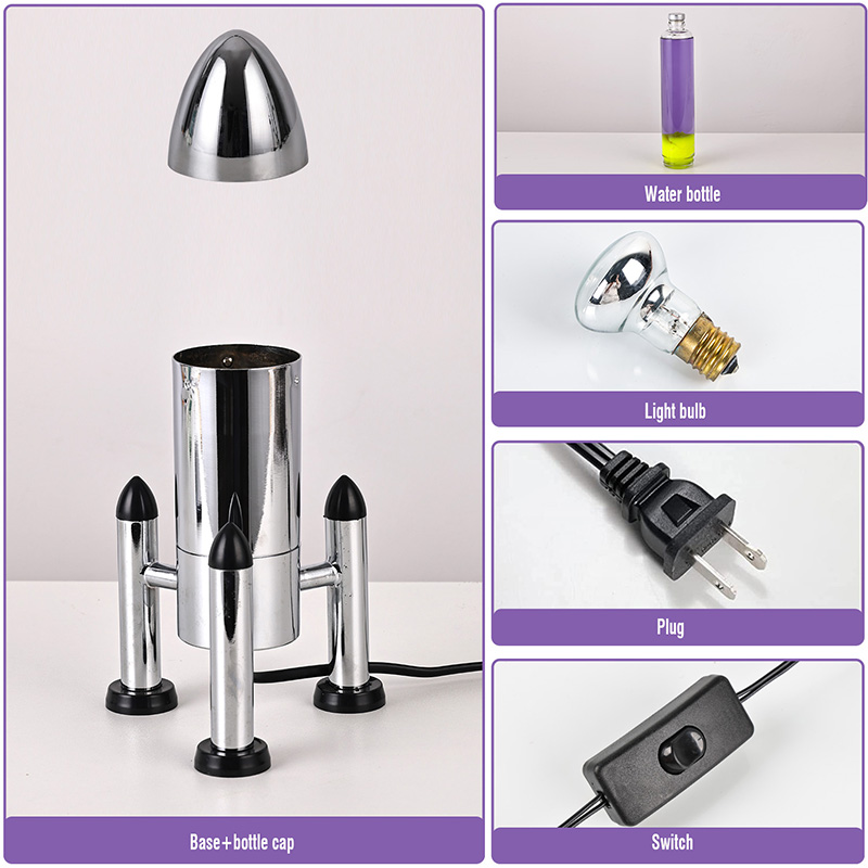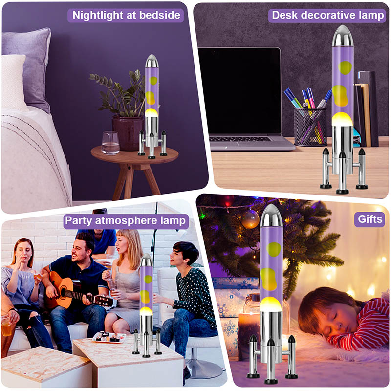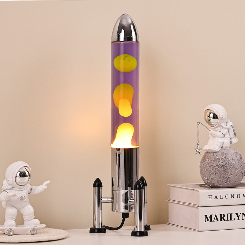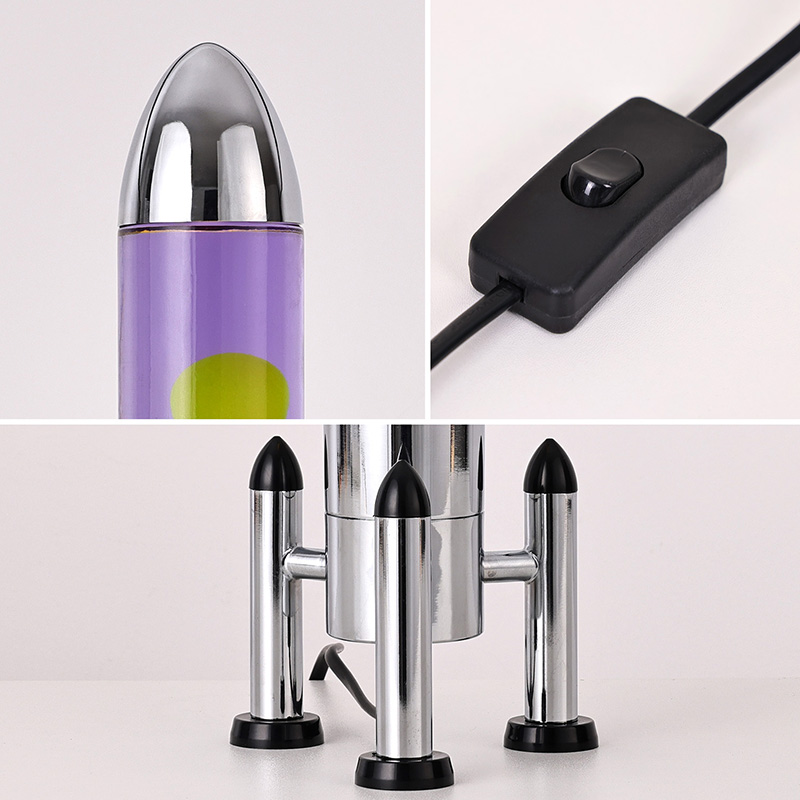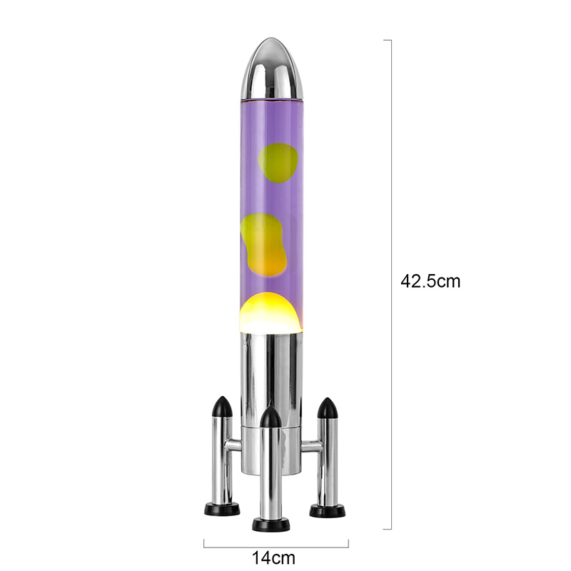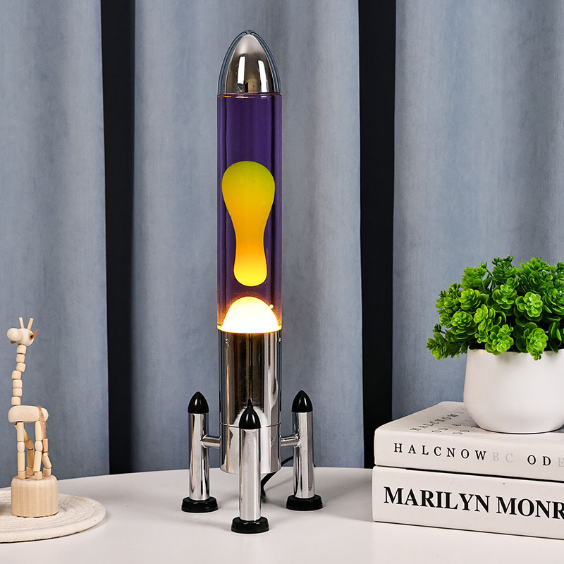 24VStor LED Lava-lampa med raketskärm har en klassisk raketformad design, med ett silvermetallskal tillsammans med en genomskinlig glasflaskkropp, enkel men elegant. Gult flyter i den lila vätskan inuti