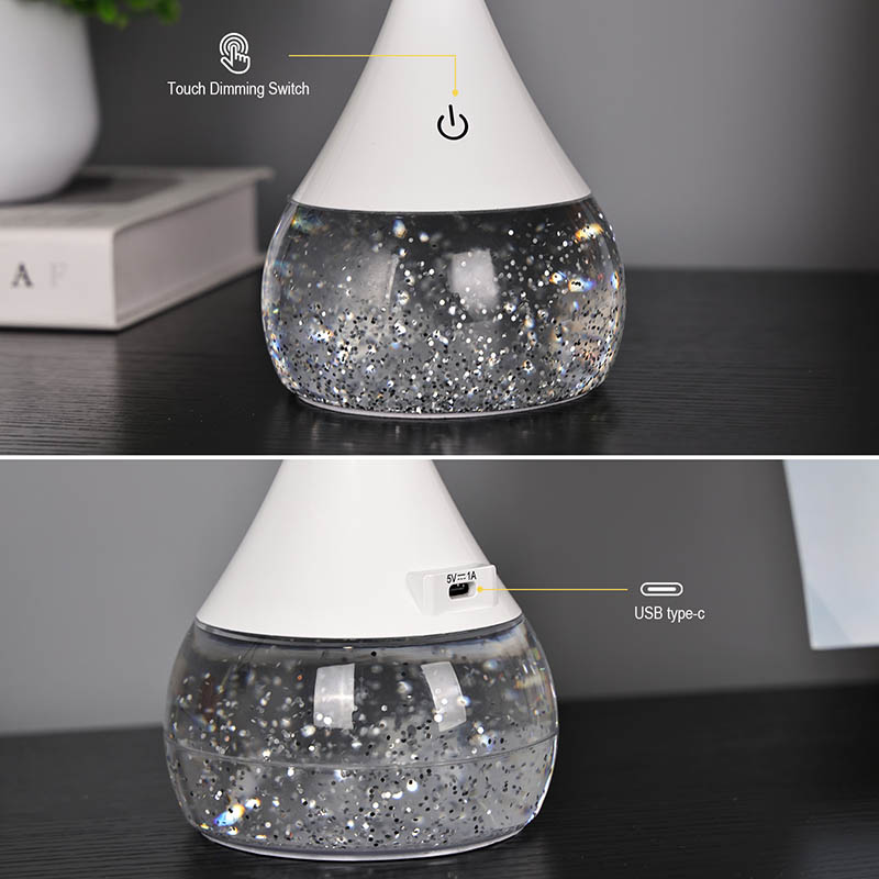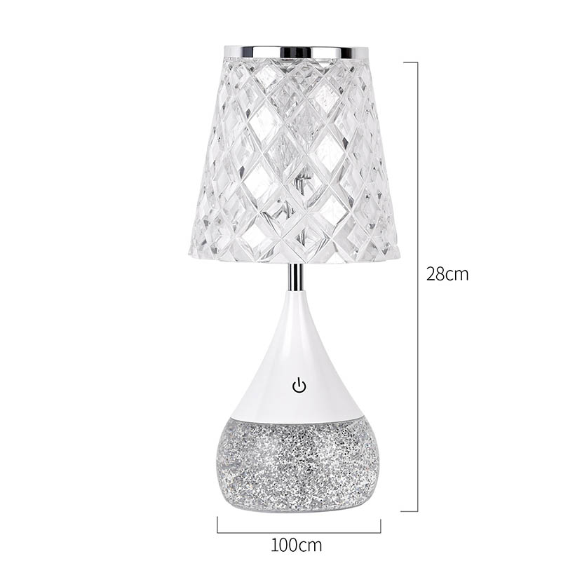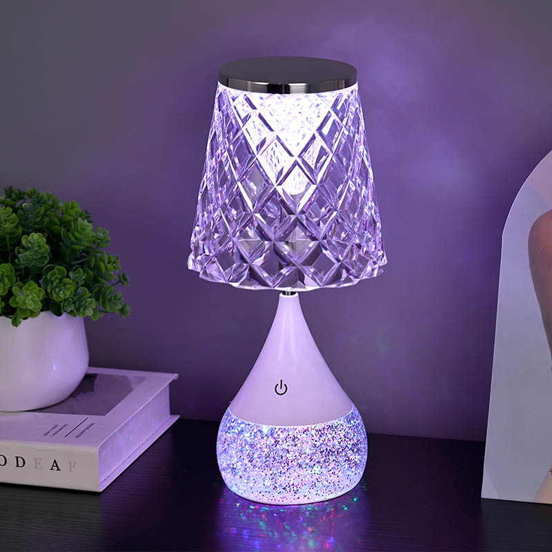 De skimrande ljuspartiklarna skapas genom interaktion mellan ljus och de diamantskurna mönstren på lampskärmen. När ljuset passerar och reflekterar från fasetterna skapar det ett dynamiskt och ständigt föränderligt mönster av ljus och skugga. Denna effekt förbättras ytterligare av lampskärmens transparens, som gör att ljuset kan passera genom och belysa det omgivande området, vilket skapar en vacker haloeffekt som ger djup och dimension till den övergripande designen. Modern elegans möter banbrytande teknik Den kristalllampskade RGB-färgen -Schanging Shimmering Desk Lamp är ett perfekt exempel på hur modern design kan sömlöst integrera avancerad teknik. Lampans eleganta och minimalistiska bas, utformad från högkvalitativa material, ger en stabil och robust grund för lampskärmen samtidigt som den lägger till en touch av sofistikering till den övergripande designen. Basen finns i en mängd färger för att matcha alla dekorstil, från klassisk vit till modern svart eller elegant silver.