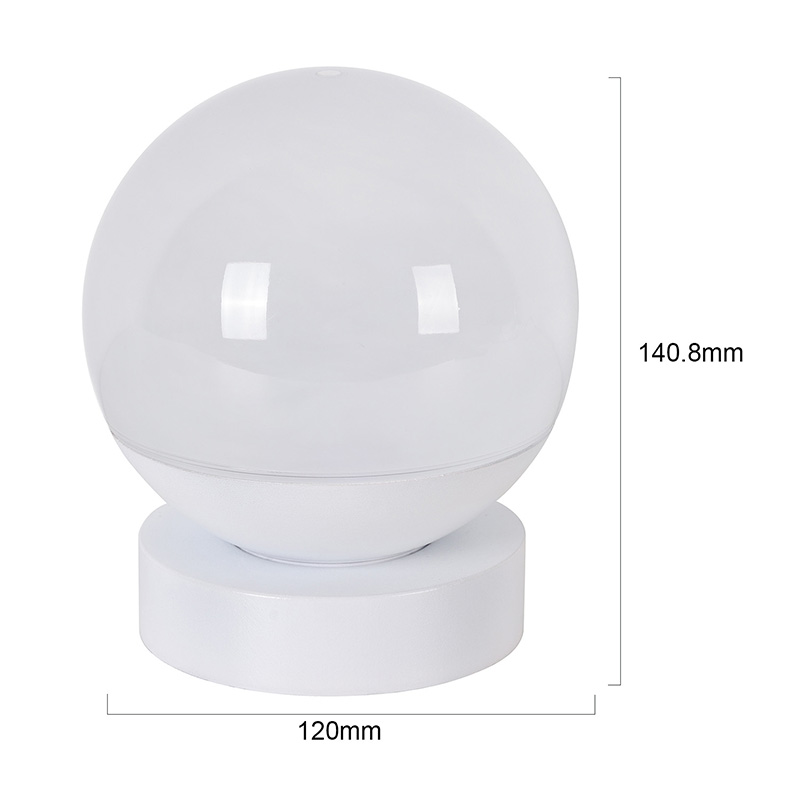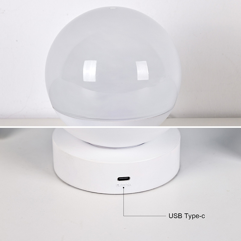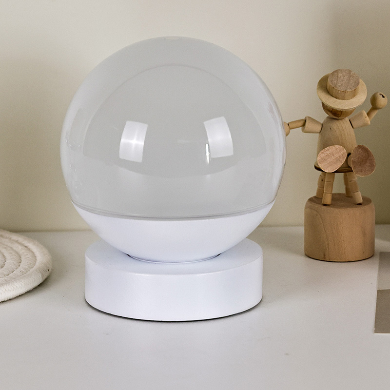 Den övergripande designen har en rundad sfär, med den övre halvan gjord av genomskinligt frostat material som avger ett mjukt, milt ljus. Den nedre halvan består av en vit bas för stabilt stöd, med rena och släta linjer. Dess kompakta storlek