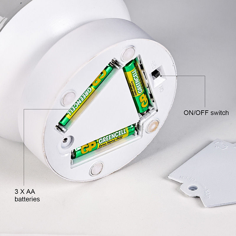 Inget behov av att ansluta; den kan drivas av bara 3 AAA-batterier, med enkel installation och flexibel användning. Oavsett om den placeras på ett nattduksbord, skrivbord, spjälsäng eller camping