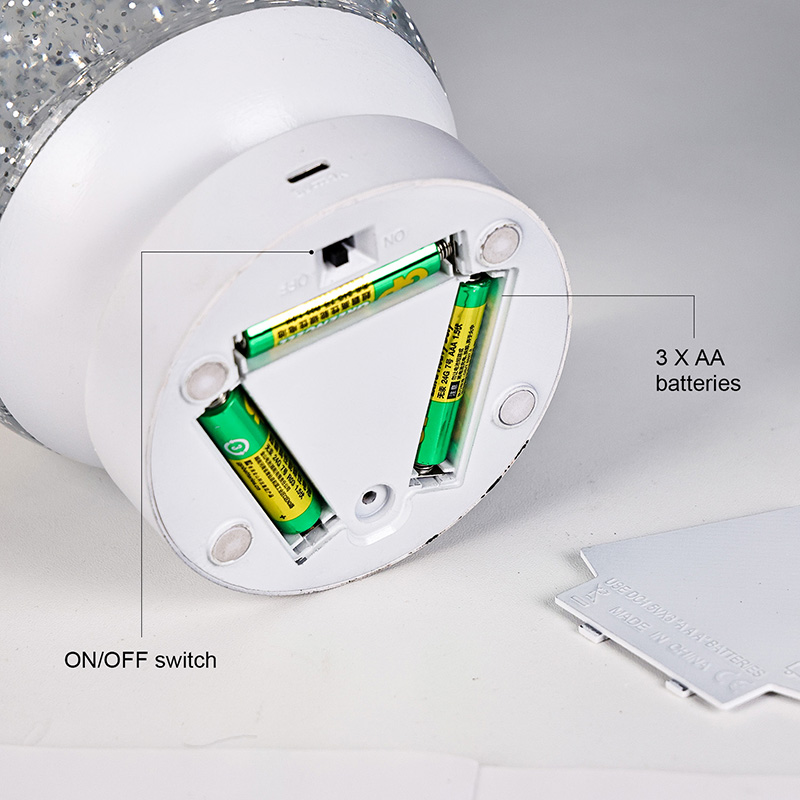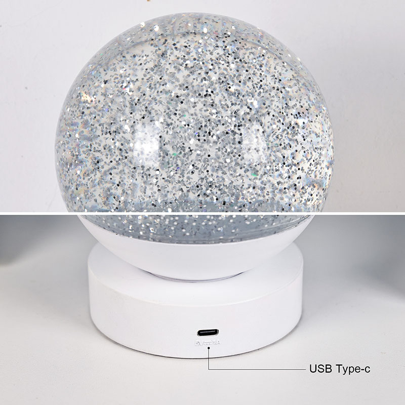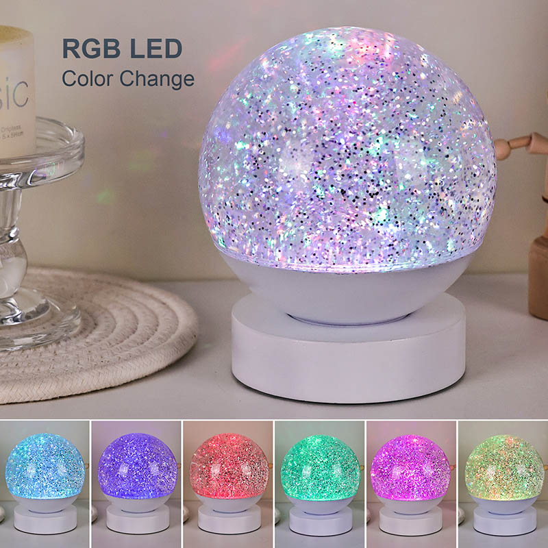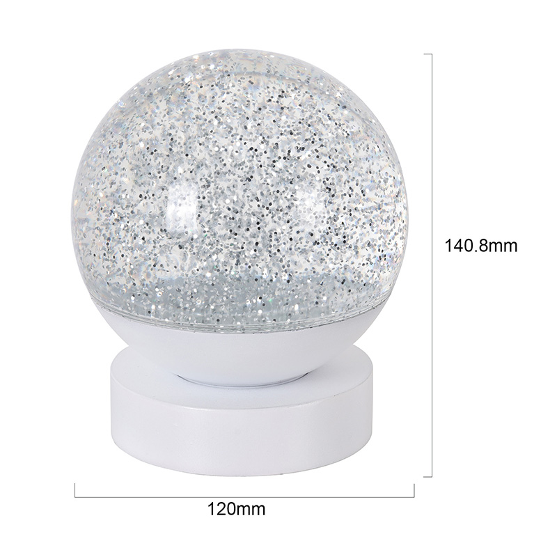 Led RGB Glitter Decor Lamp är gjord av högkvalitativt akrylmaterial, med en genomskinlig sfär med utmärkt ljustransmission. Basen är tillverkad av miljövänlig ABS-plast, vilket garanterar stabilitet, hållbarhet och säkerhet utan giftiga ämnen. Den drivs med tre inbyggda AAA-batterier (batterier säljs separat), vilket eliminerar behovet av ett eluttag och erbjuder bekväm användning. Perfekt för placering vid sängen, skrivbordet eller i ett barns leksakshörna. Med en enkel pekströmbrytare kan ljuset enkelt slås på eller av, vilket gör det användarvänligt även för barn att arbeta självständigt.