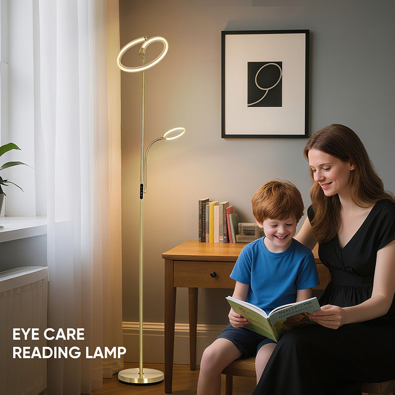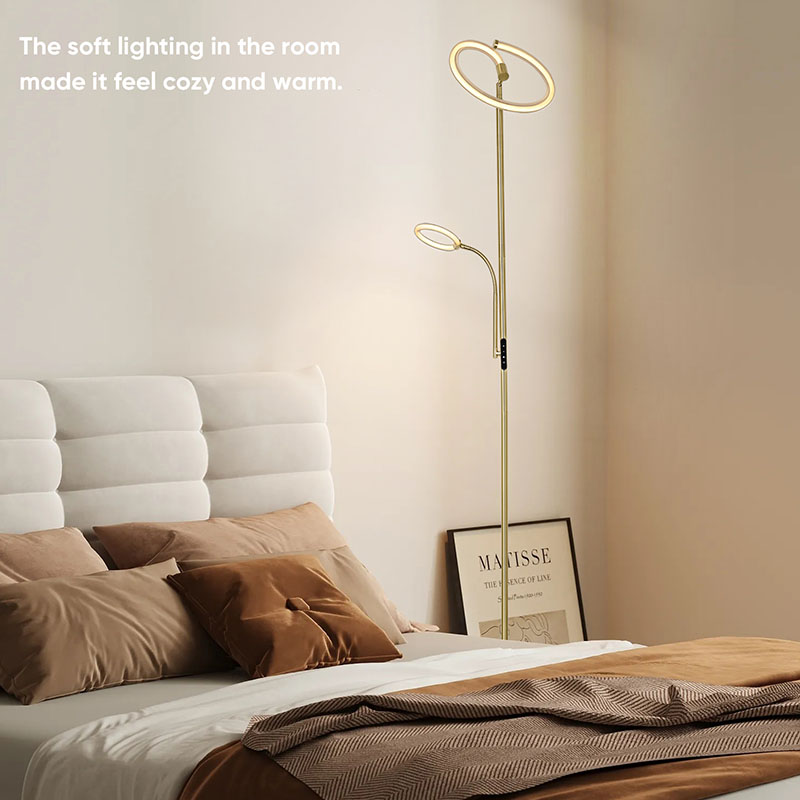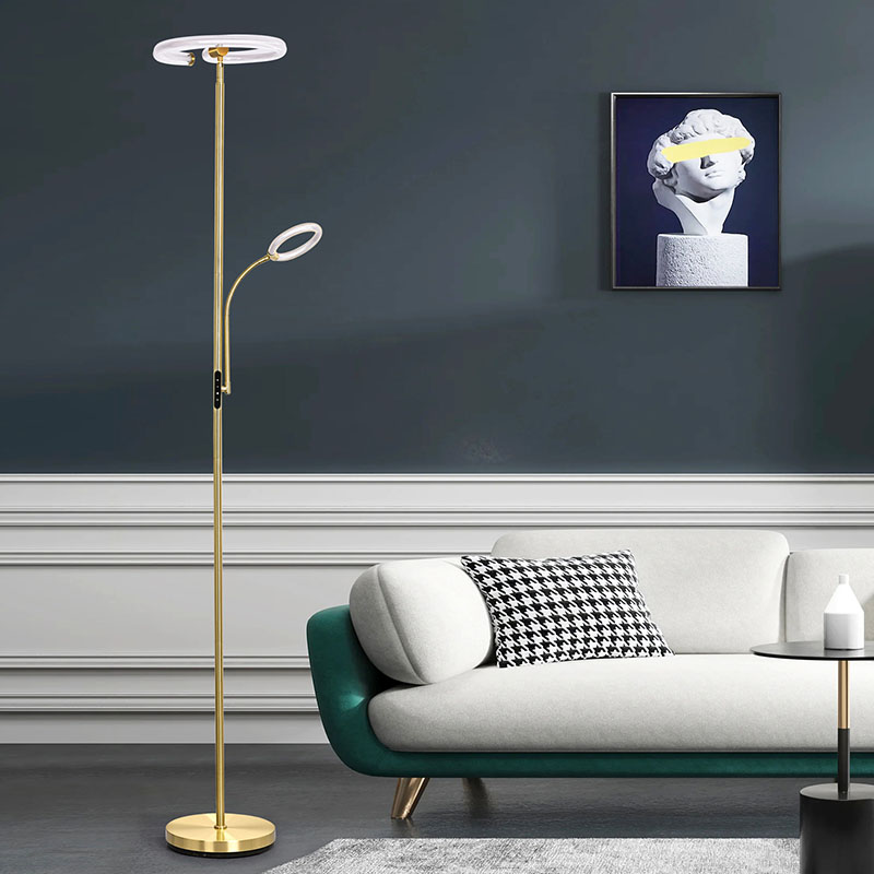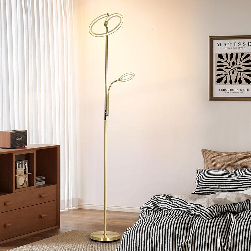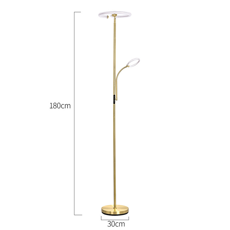 Lyx guld led golvlampa för vardagsrum är gjord av högkvalitativt gyllene metallmaterial, med en enkel men lyxig design. Metallmaterialet är finpolerat och behandlat, med en slät och delikat yta och en mjuk lyster, som visar upp en ädel och elegant atmosfär. Oavsett om den placeras i vardagsrummet, sovrummet eller