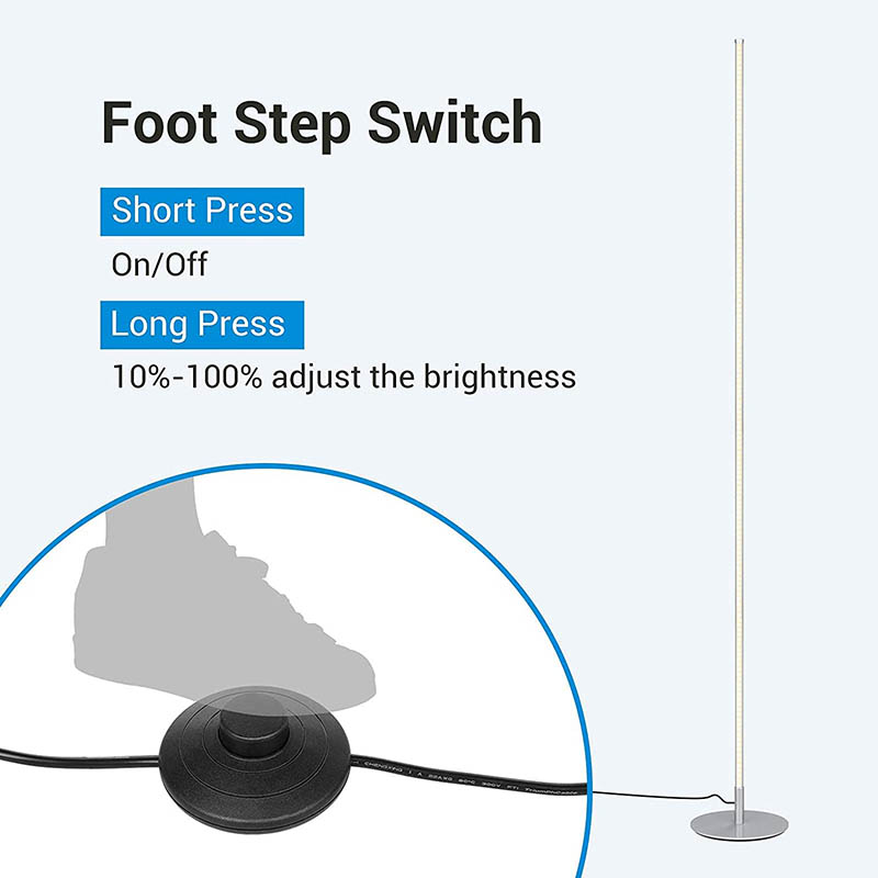 Vår LED-golvlampa är designad med bekvämlighet i åtanke och har en fotkontakt för enkel användning. Trampa bara på strömbrytaren för att tända eller släcka lampan, vilket gör det enkelt att styra belysningen utan att behöva fumla efter knappar eller strömbrytare. Denna genomtänkta designdetalj förbättrar den övergripande användarupplevelsen och säkerställer att manövreringen av lampan är så enkel och intuitiv som möjligt.