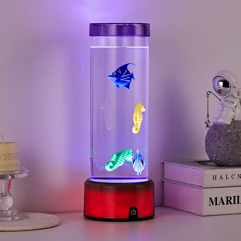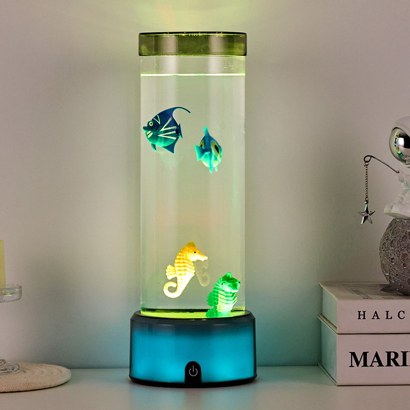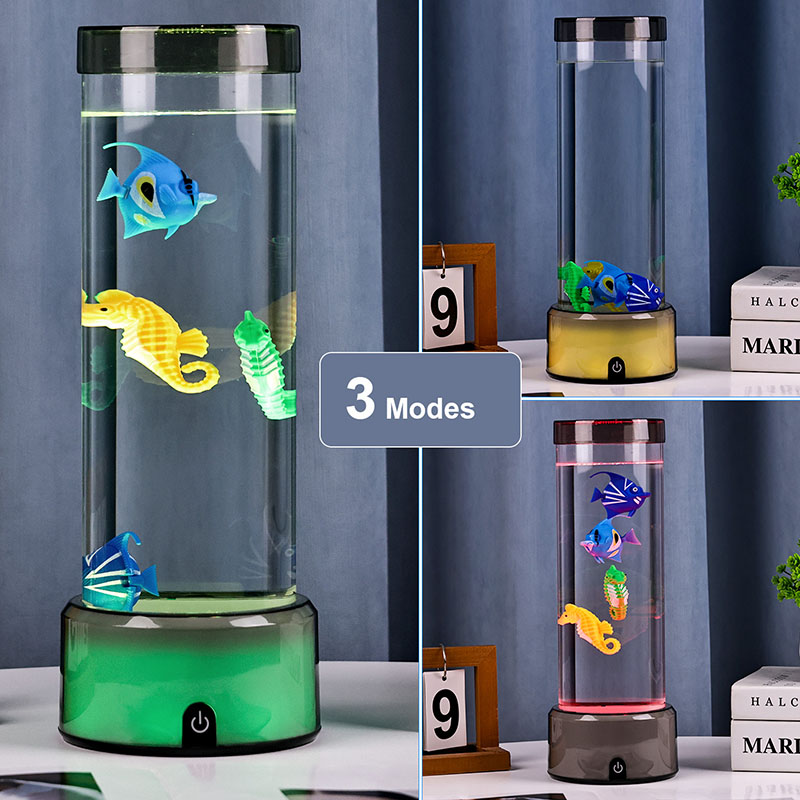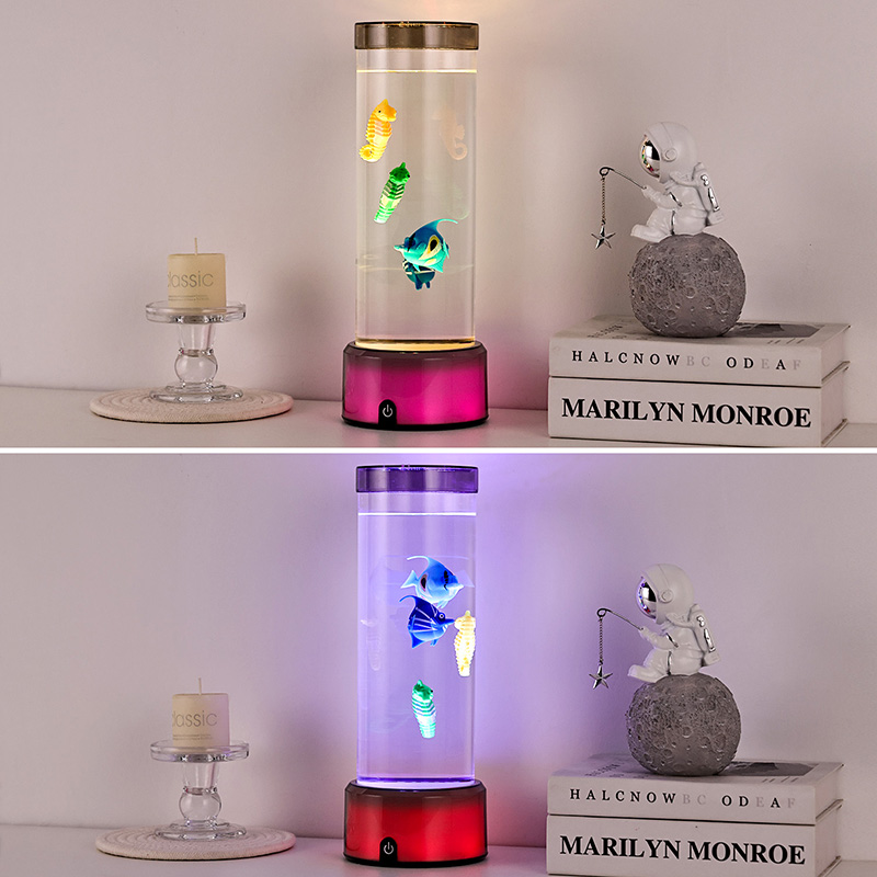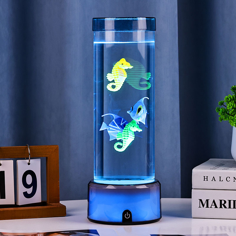 charm. Den här fängslande lampan är tillverkad av hållbar plast av hög kvalitet och har en elegant cylindrisk kropp fylld med klar vätska och vackert detaljerade flytande fiskfigurer – inklusive livfulla tropiska fiskar och en charmig sjöhäst – som skapar en fridfull, verklighetstrogen havsscen som ger lugn och visuell förtjusning till alla rum.