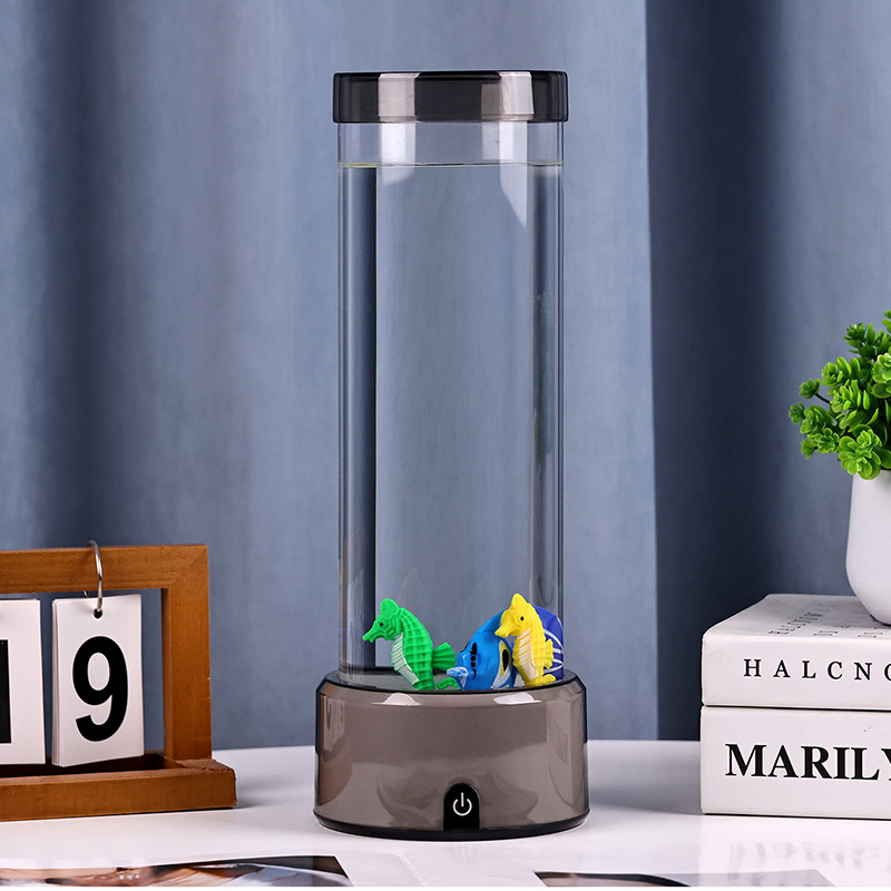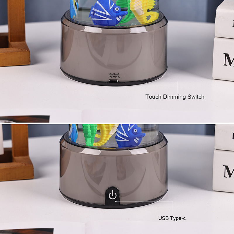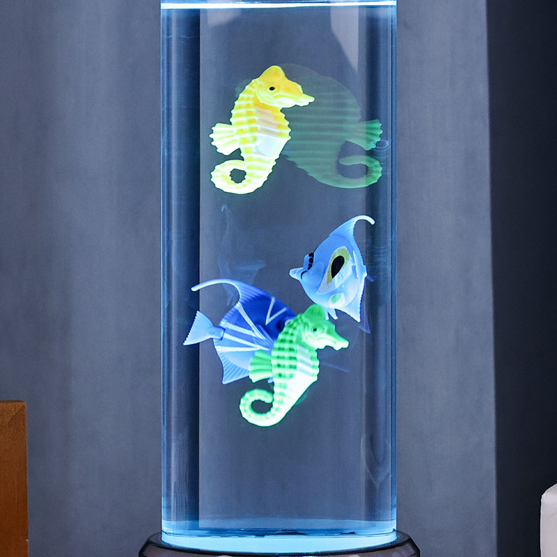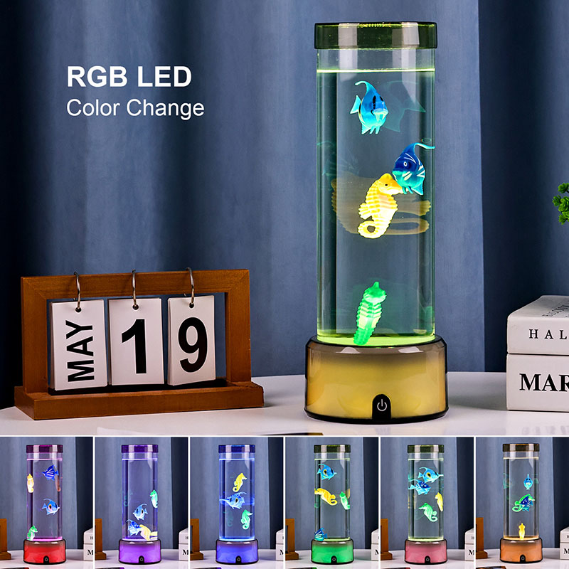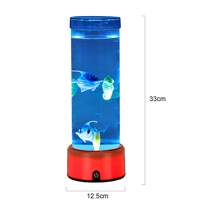charm. Den här fängslande lampan är tillverkad av hållbar plast av hög kvalitet och har en elegant cylindrisk kropp fylld med klar vätska och vackert detaljerade flytande fiskfigurer – inklusive livfulla tropiska fiskar och en charmig sjöhäst – som skapar en fridfull, verklighetstrogen havsscen som ger lugn och visuell förtjusning till alla rum.