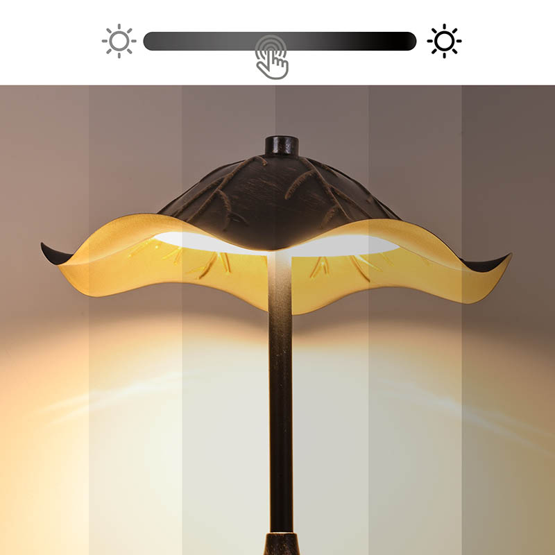 Mittpunkten i denna lampa är dess slående paraplyliknande topp, som påminner om en delikat svamphatt prydd med intrikata gyllene bladmönster. Denna design ger inte bara en touch av naturinspirerad skönhet till din omgivning utan fungerar också som ett funktionellt diffusionskåp för ljuskällan, vilket skapar en mjuk, jämn glöd som är trevlig för ögonen.