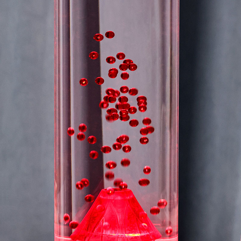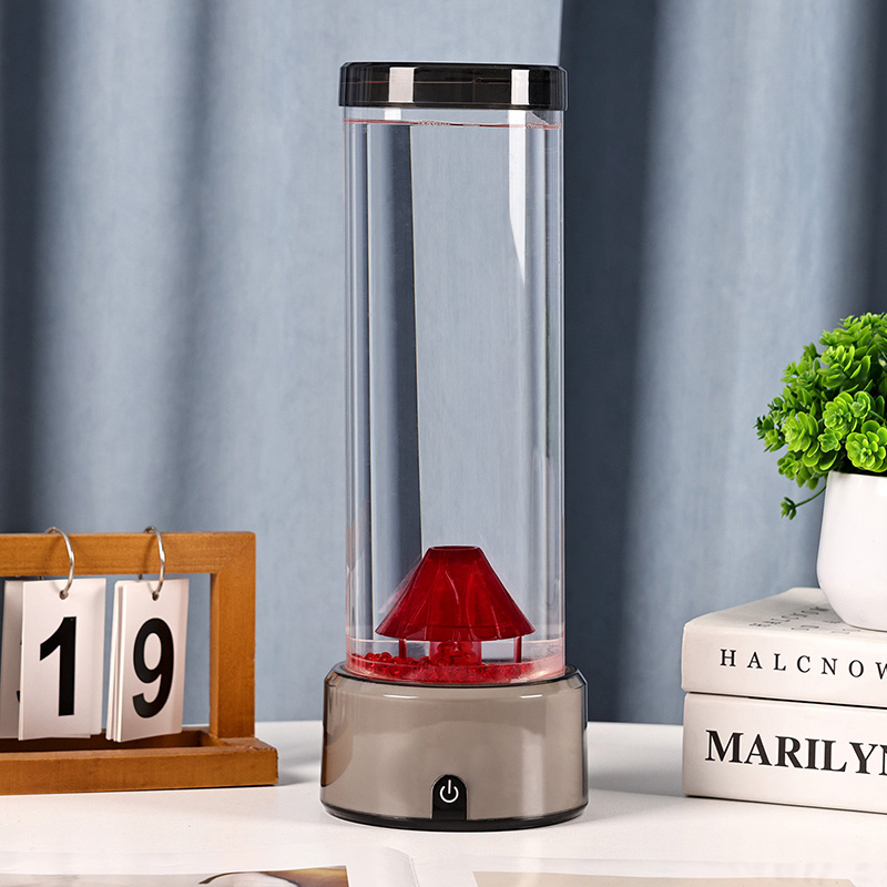 I hjärtat av lampan ligger en miniatyrvulkanmodell, intrikat designad för att likna en riktig vulkankon. När den slås på börjar vulkanen att "bryta ut" och skickar rödfärgade partiklar uppåt genom vätskekolonnen i en kontinuerlig, rytmisk rörelse. Dessa partiklar, suspenderade i en speciellt formulerad giftfri vätska, stiger och faller som lavabubblor, vilket skapar en hypnotisk effekt som påminner om en aktiv vulkan. Rörelsen drivs av ett litet internt pumpsystem, som cirkulerar vätskan skonsamt men konsekvent, vilket säkerställer långvarig prestanda utan överhettning.
