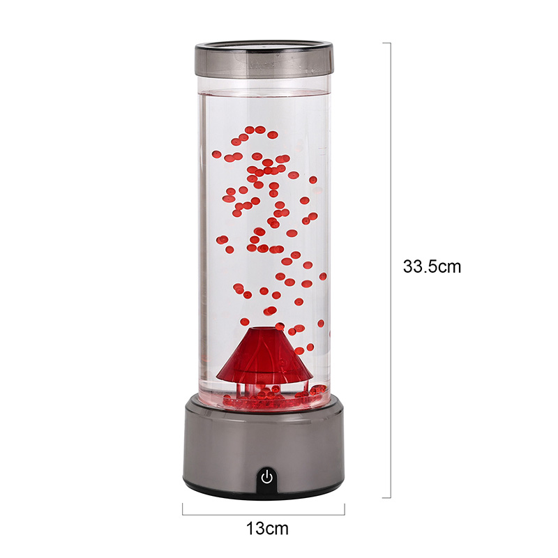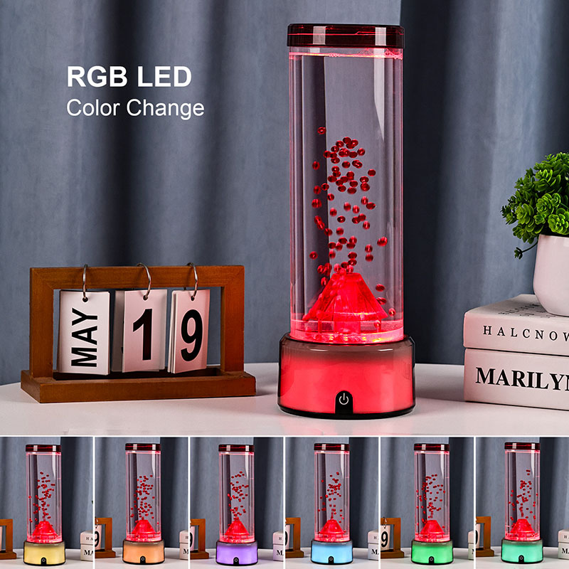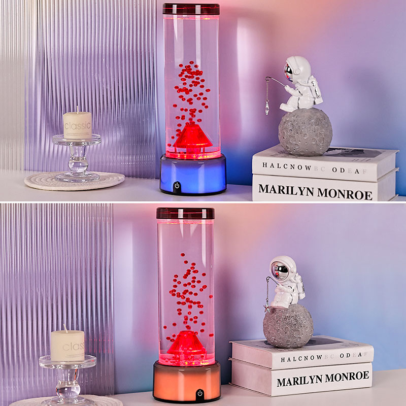 Designad med noggrann uppmärksamhet på detaljer, denna vulkanformade LED-lampa har en cylindrisk vätskekammare fylld med klar vätska och flytande röda partiklar som simulerar ett vulkanutbrott när den aktiveras. Lampans bas lyser med livfulla, färgskiftande RGB-ljus, medan den centrala vulkanstrukturen pulserar med eldig belysning, som efterliknar ett verkligt utbrott. Samtidigt svävar känsliga manetliknande dekorationer graciöst i vätskekolonnen och tillför en surrealistisk undervattensatmosfär. Tillsammans skapar dessa element ett fascinerande visuellt spektakel som kombinerar naturens kraft med modern designs elegans. Design och estetisk tilltalande RGB Color-Changing Volcano Lamp är cirka 12 tum hög, vilket gör den idealisk för placering på skrivbord, nattduksbord, hyllor eller som en slående dekorativ del, eller till och med i klassrum, sovrum. Dess eleganta, moderna siluett har ett genomskinligt cylindriskt rör tillverkat av högkvalitativ, splitterbeständig plast, vilket garanterar hållbarhet och säkerhet. Topplocket är förseglat säkert för att förhindra läckage, medan basen är tillverkad av slät, matt plast med inbyggd kontrollpanel.